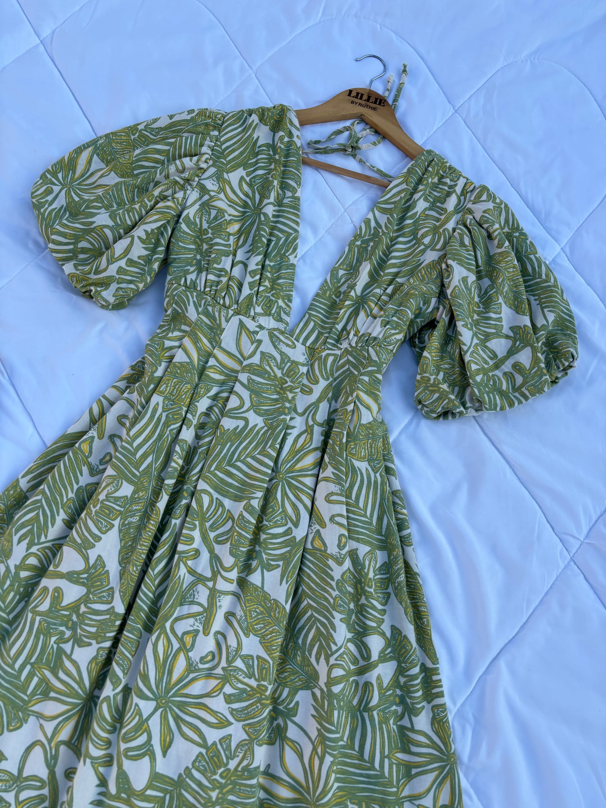 Cotton linen floral dress with deep V neckline and puffy sleeves