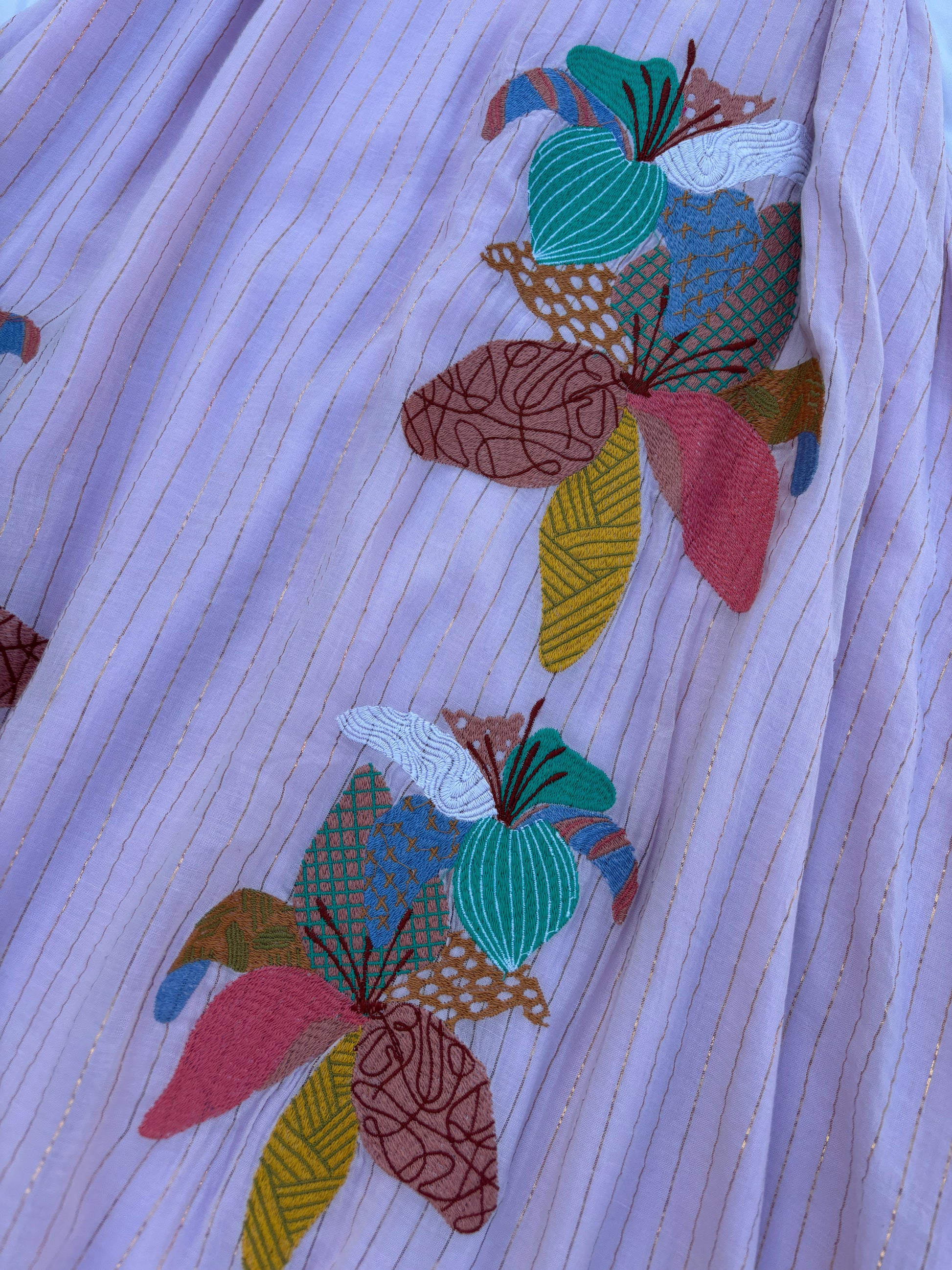 Lavender gold stripes with embroidered flower patches, cotton fabric with lining and beads on sleeves
