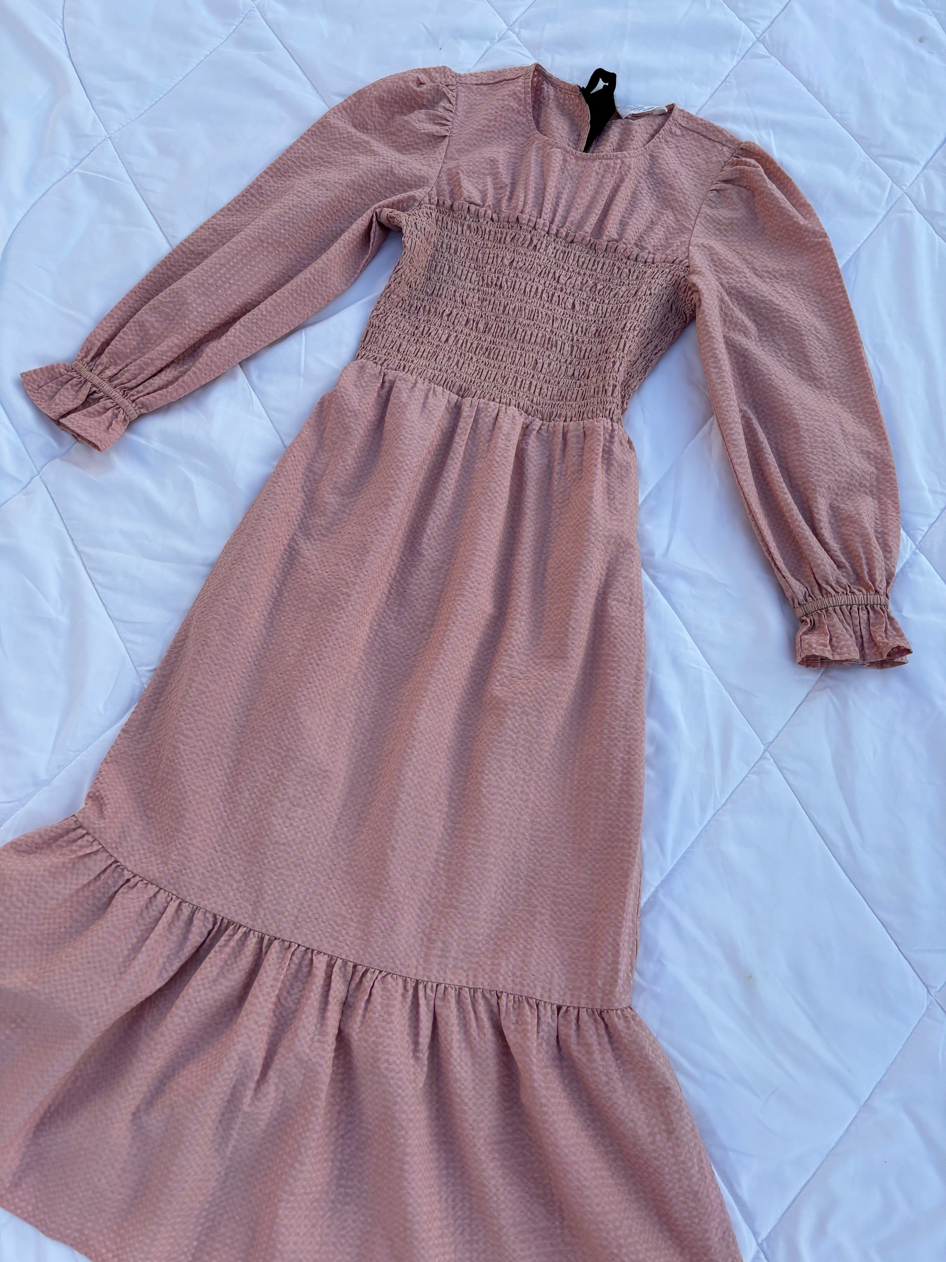Gingham dress in nude colour, smock body, full sleeves and flared hem.