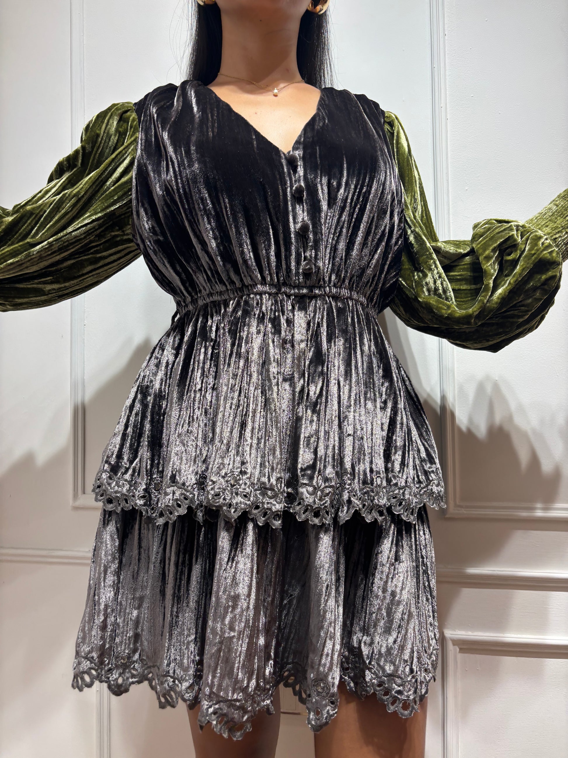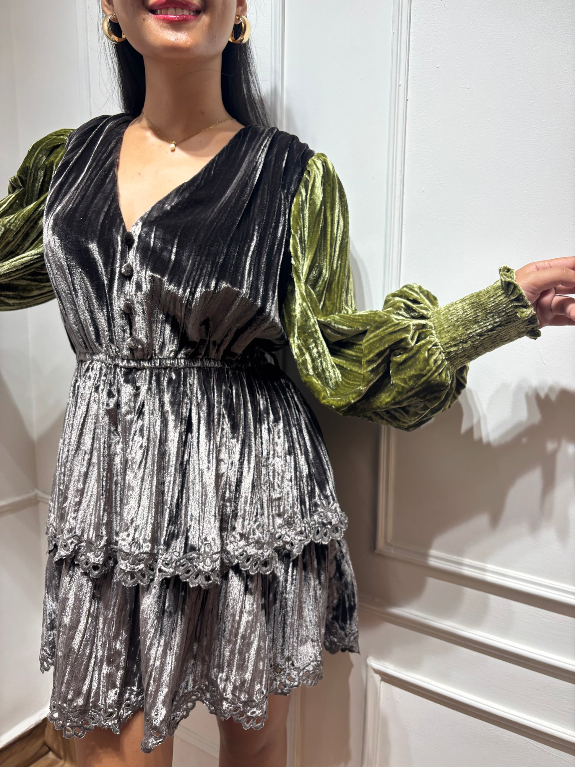 Colourblock pleated velvet ruffle dress with scallop hem and overlock with stone details.