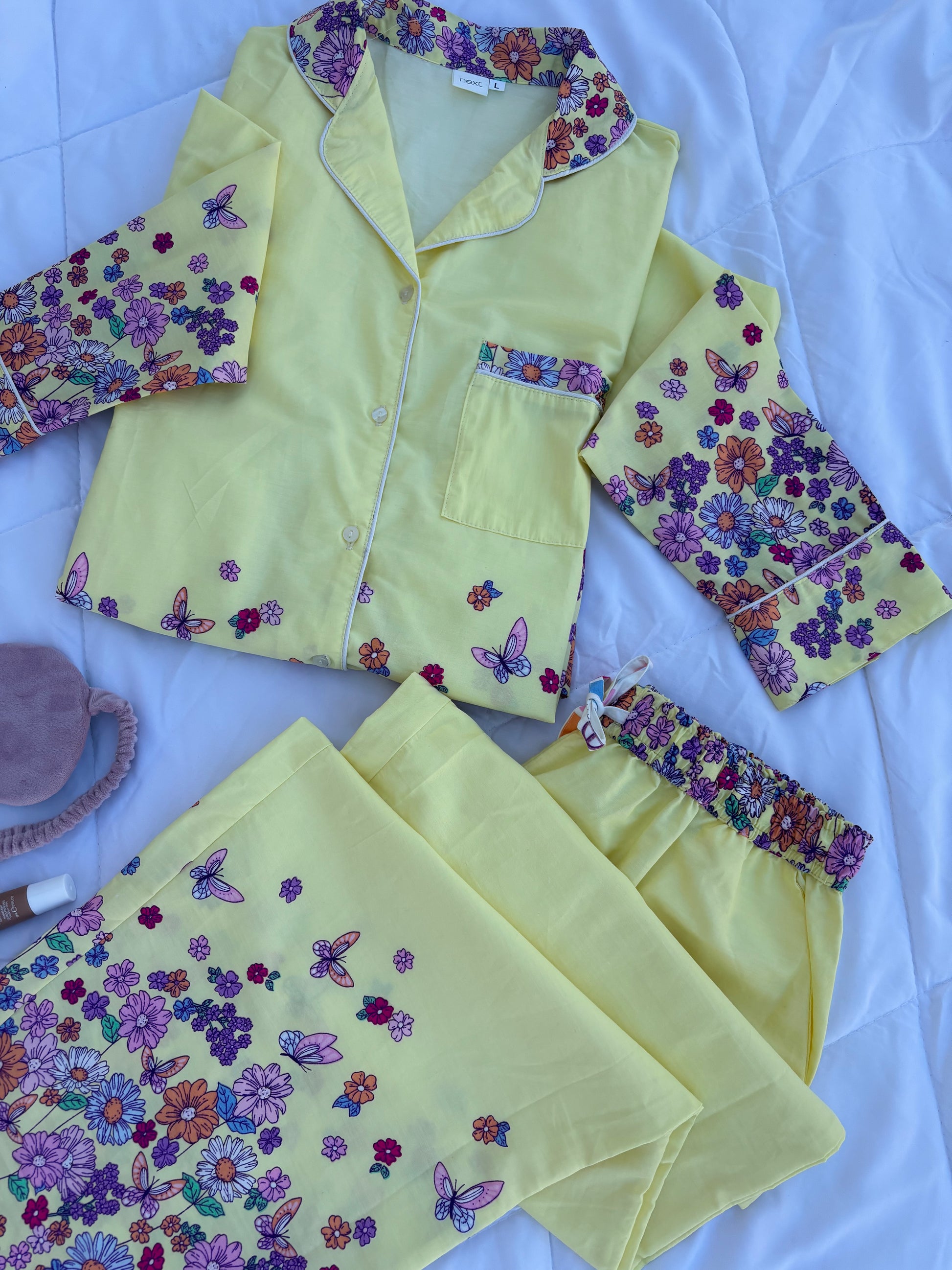 Pretty border printed floral cotton cambric PJ Set with full sleeves and Long pant. Piping detail with front patch pocket shirt and elastic waist drawstring with pockets on pants.
