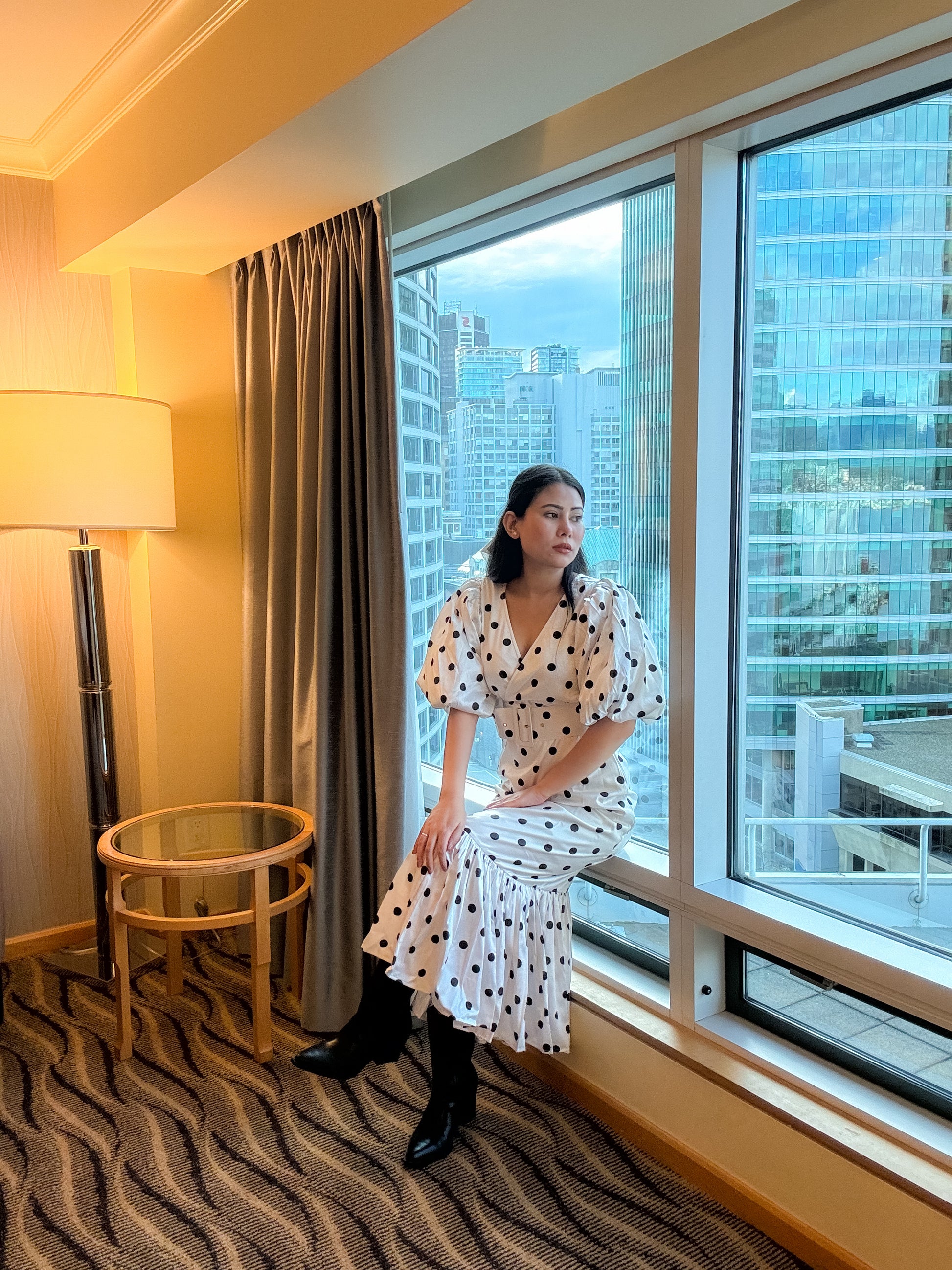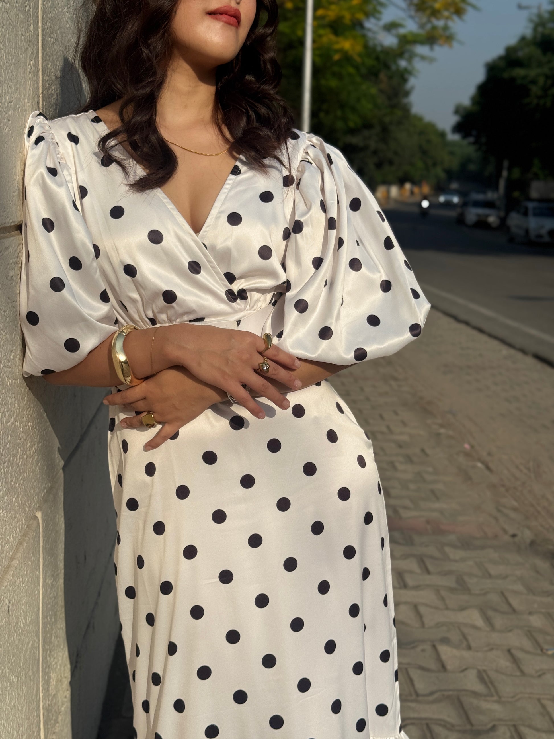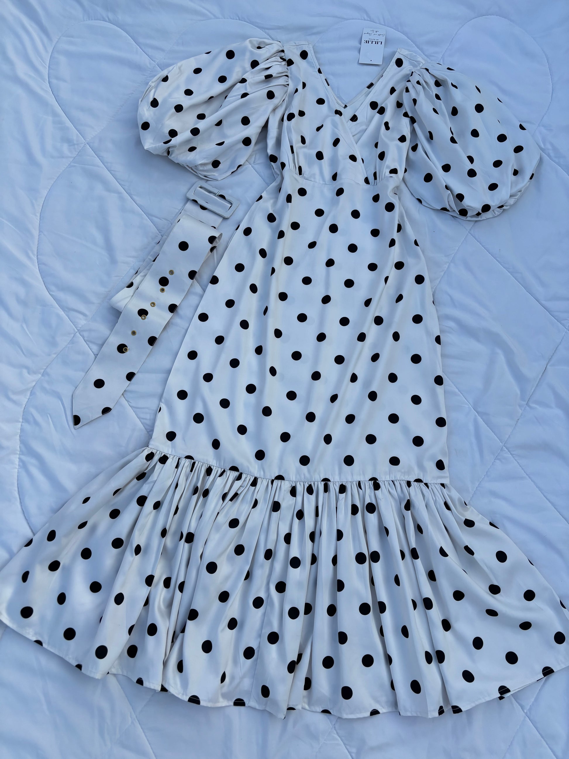 Premium quality satin fabric polkadot dress, thicker satin quality with detachable belt, puffy sleeves with organza layer, gathered hem detail.