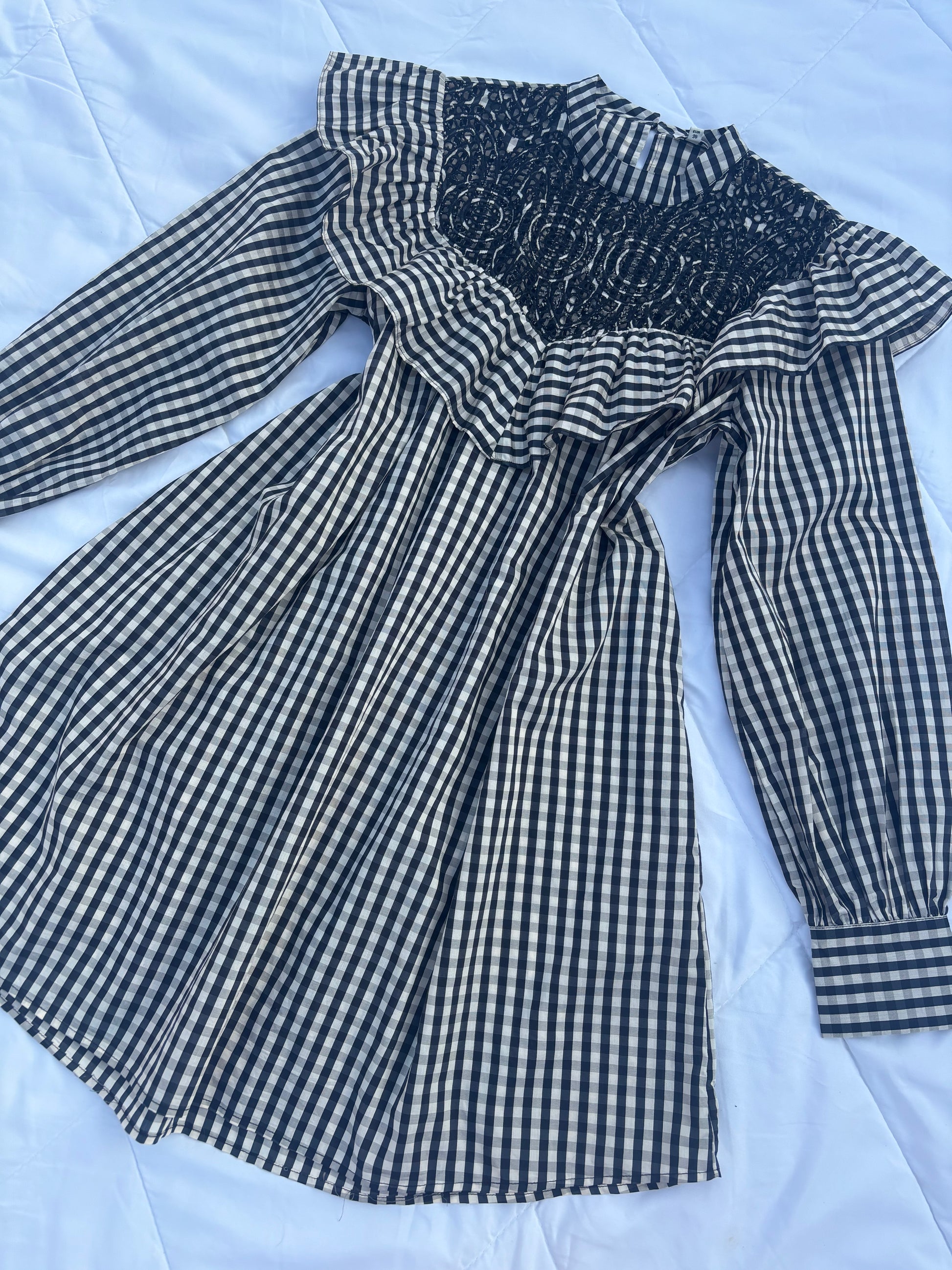 Cotton gingham dress with yoke lace and ruffle detail and fullsleeve