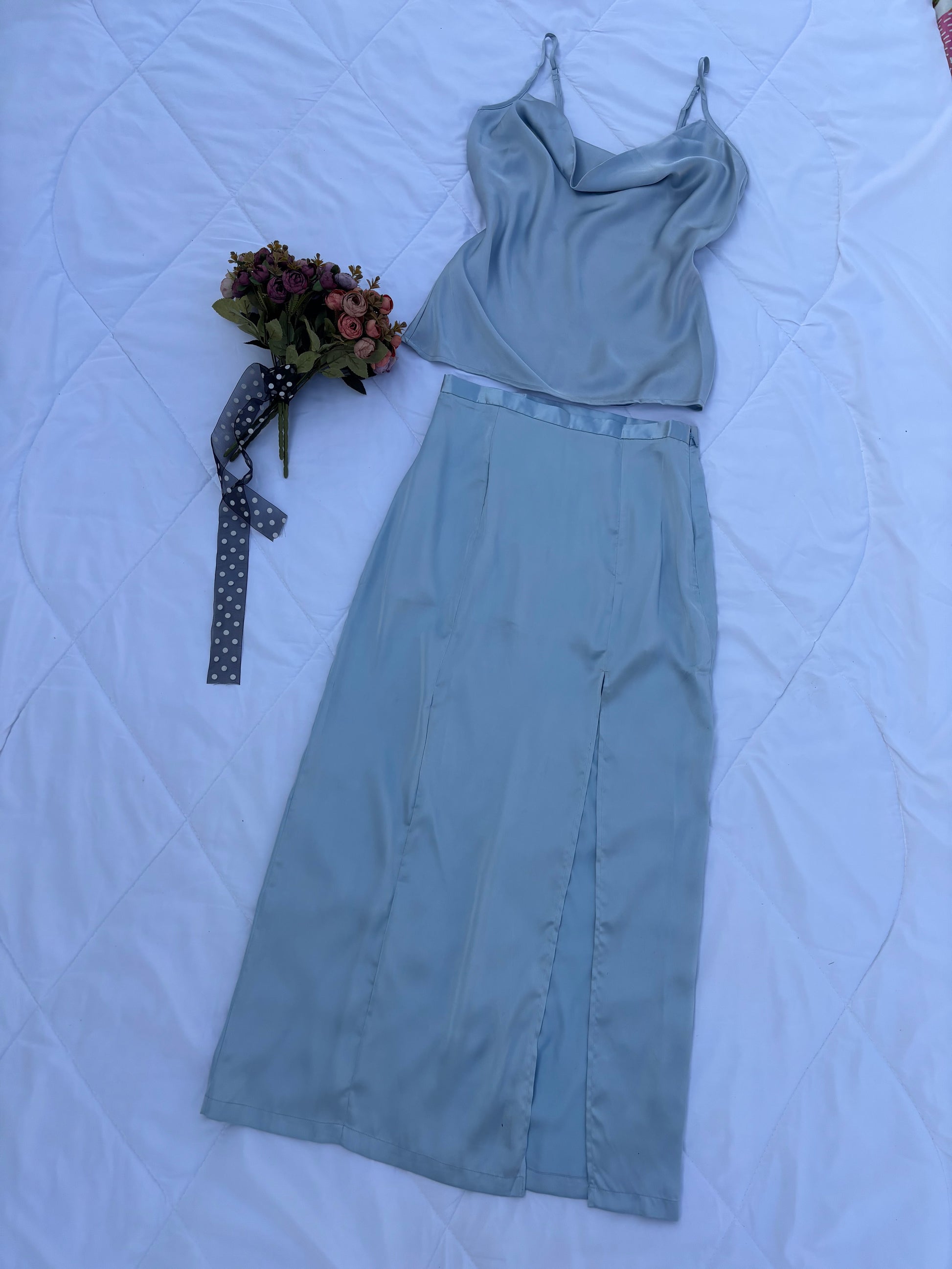 Satin two piece set of top and skirt with slit on the skirt