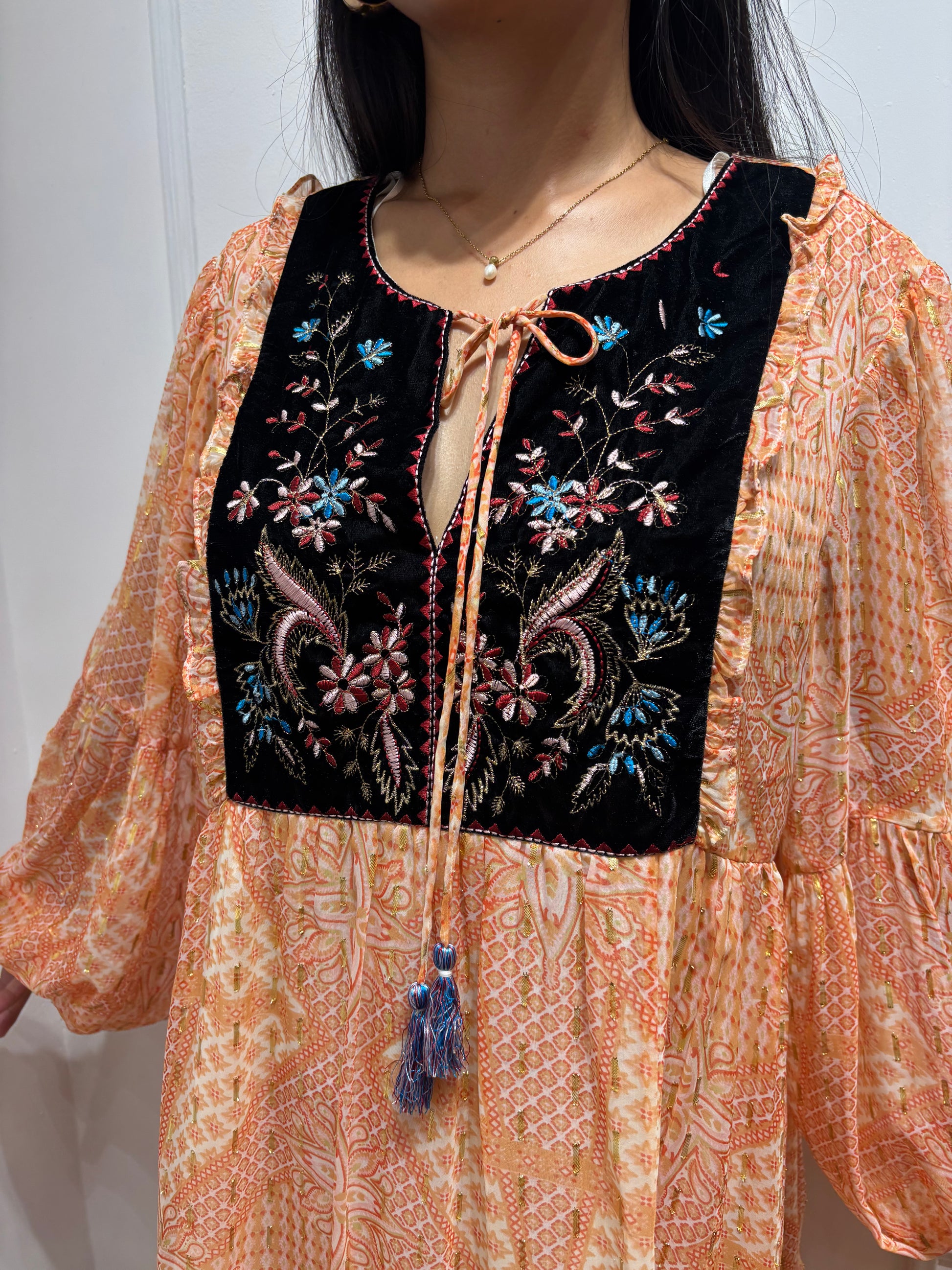 Chiffon floral dress with yoke embroidered and tie detail and lining inside