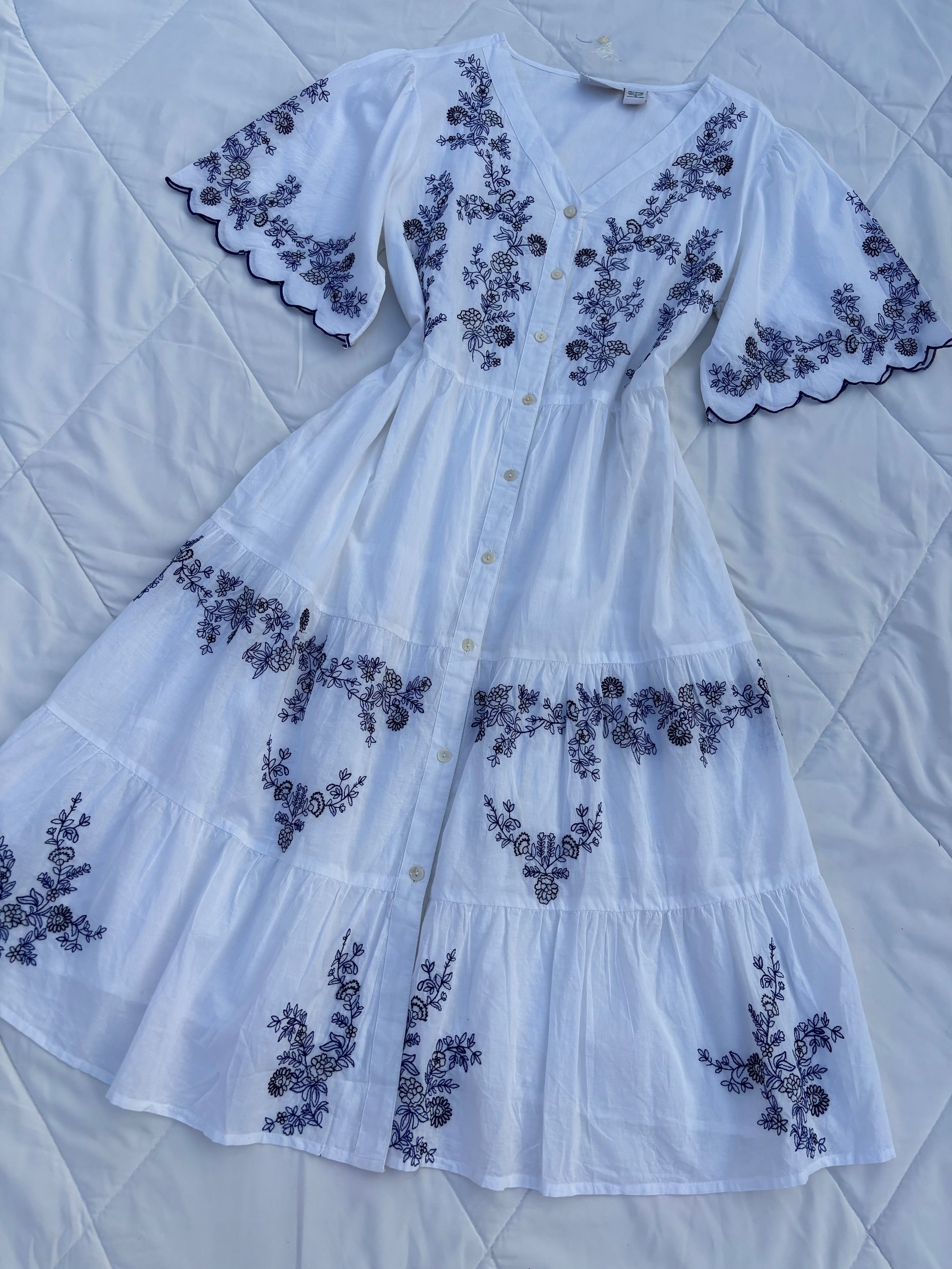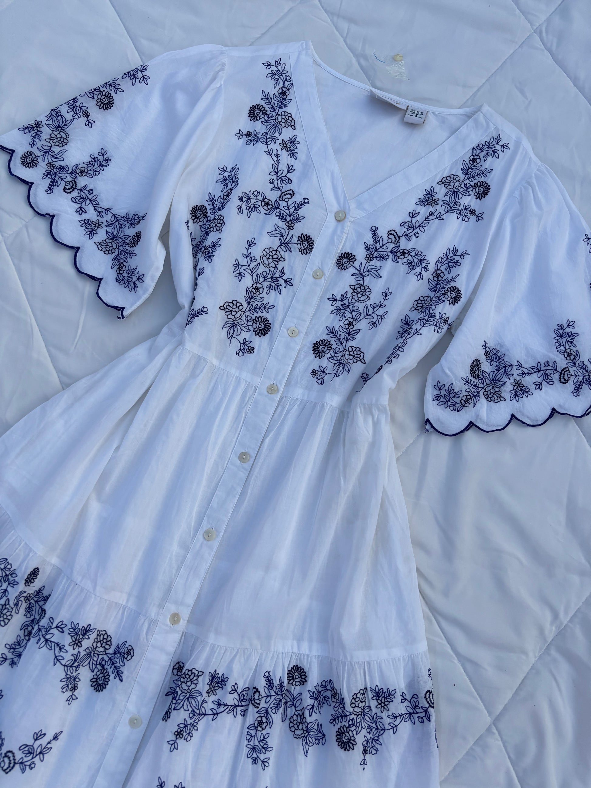 White cotton embroidery midi dress with buttons at the front and scalloping detail.