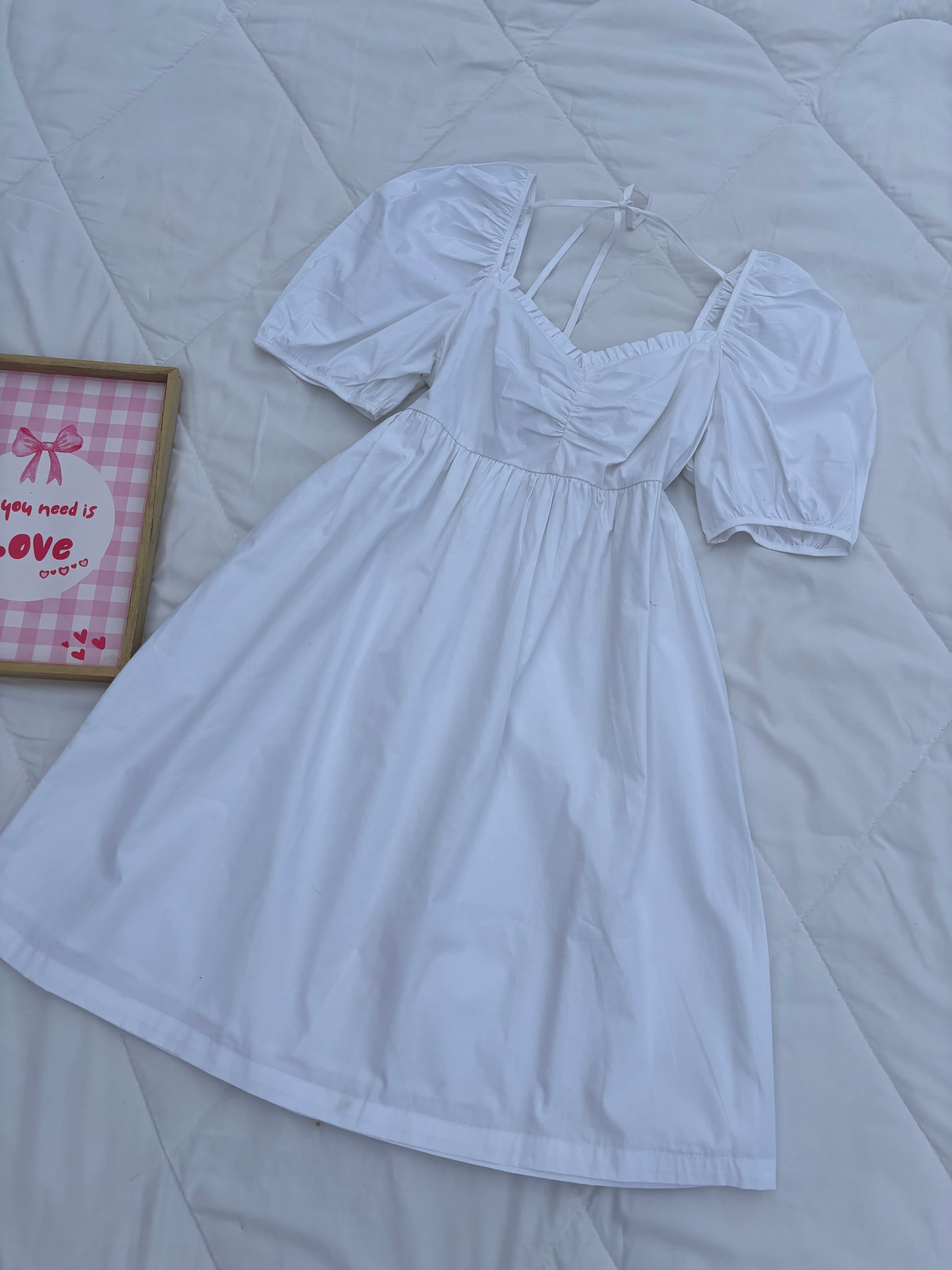 White poplin cotton knee length dress, sweetheart neckline and tie at the back